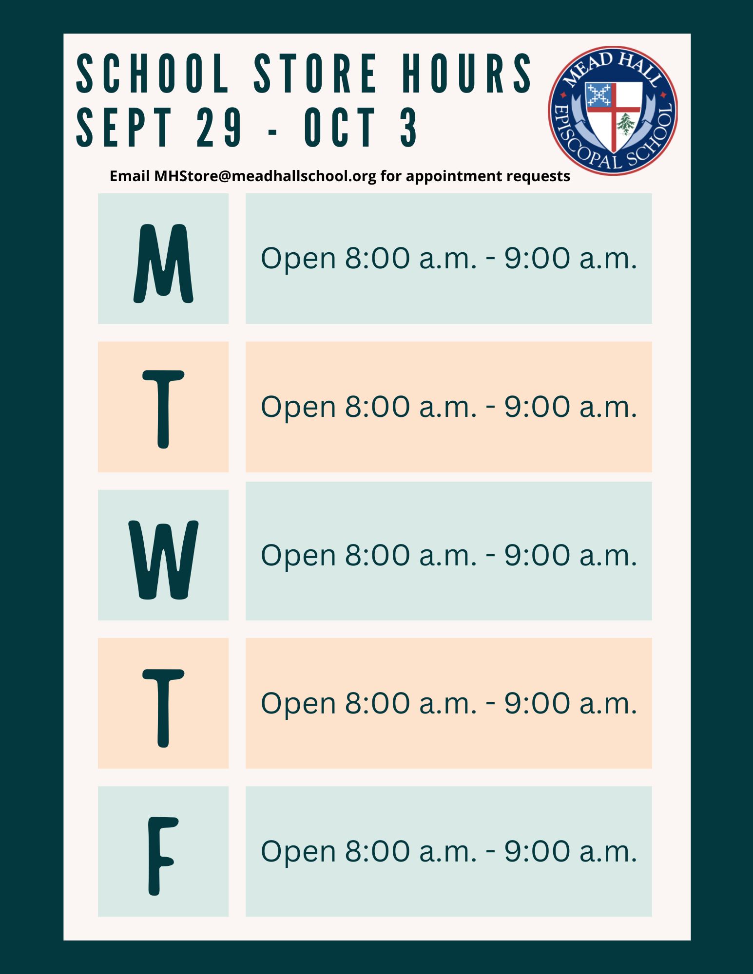 Store hours are subject to change. Please check the Mead Hall Facebook page for updates or email MHStore@meadhallschool.org